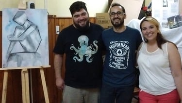 ADEU (Asociación de estudiantes universitarios de Berazategui) es un espacio plural, transparente y de libre expresión y, gentilmente, abrió sus puertas a la segunda presentación de la novela "Kilómetro 26". Para la ocasión conté con la presencia del escritor Ángel Daniel Solís, que ofició de presentador, y de Noelia Pottes, artista plástica de la zona que hacía poco tiempo había participado de una muestra en el Museo del Louvre, quien participó con una pintura alusiva a la novela y mostró algunas de sus obras. La banda de Andrés Garvie (guitarra y voz), Juan Ignacio Duarte (bajo) y Marcelo Leonel Acosta (batería) dio el presente para cerrar el evento con su banda "Jinetes cósmicos". Agradezco a Marcelo, uno de los coordinadores del Berazategui Rock, por la buena predisposición al ponerme en contacto con los músicos y a ellos por la amabilidad de tocar en vivo.